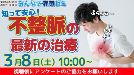 社会福祉法人聖隷福祉事業団 総合病院聖隷浜松病院(静岡県浜松市)は、市民公開講座 第11回みんなで健康ゼミ「知って安心!不整脈の最新の治療」を開催します。専門の医師が不整脈についてわかりやすく解説します。 本講座は、会場にお越しいただくほか、オンライン(ライブ配信・見逃し配信)でもご覧いただけます。ぜひご参加ください。