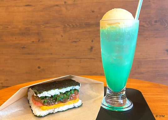 左:初音ミクのネギネギ油みそポークたまごおにぎり 右:初音ミクのエメラルドパインクリームソーダ