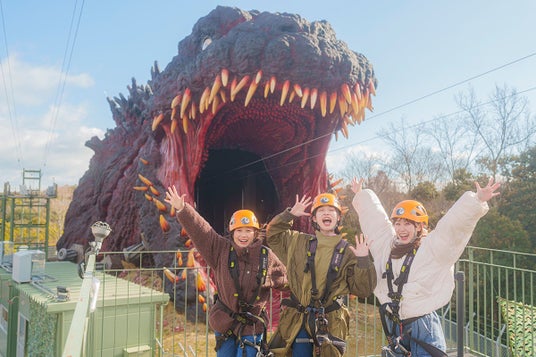 大迫力のゴジラに向かって“大滑空”女子旅ジップライン!「春のペアジップライン ~ゴジラを監視!記録写真をUPせよ!~」