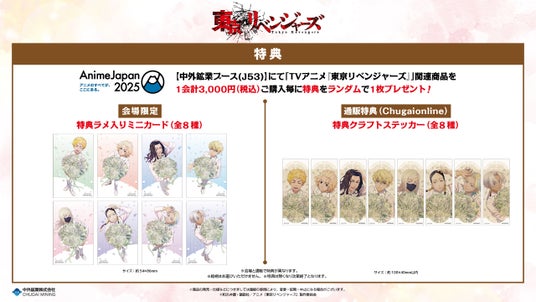 中外鉱業ブースにてTVアニメ『東京リベンジャーズ』AnimeJapan 2025関連商品を1会計3,000円(税込)ご購入毎に、ラメ入りミニカード(全8種)をランダムで1枚お渡しいたします!