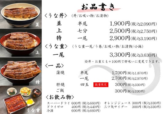 メニューは三種のうな丼とう巻がセットになったうな重のみの展開。純粋にうなぎを楽しんで頂くラインナップにしております。うな丼 並 1900円(税抜)~と非常にリーズナブルな価格で、活鰻・炭火の本格うなぎでありながら気軽に召し上がって頂けるお値打ち価格となっております。半尾と一尾のテイクアウトも承っておりますのでご自宅でも美味しいうなぎを楽しんで頂けます。