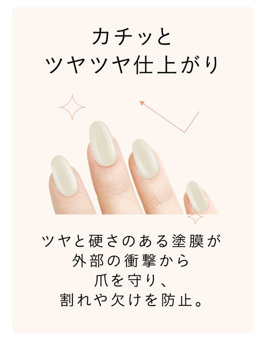 ツヤと硬さのある塗膜が外部の刺激から爪を守り、割れや欠けを防止します。
