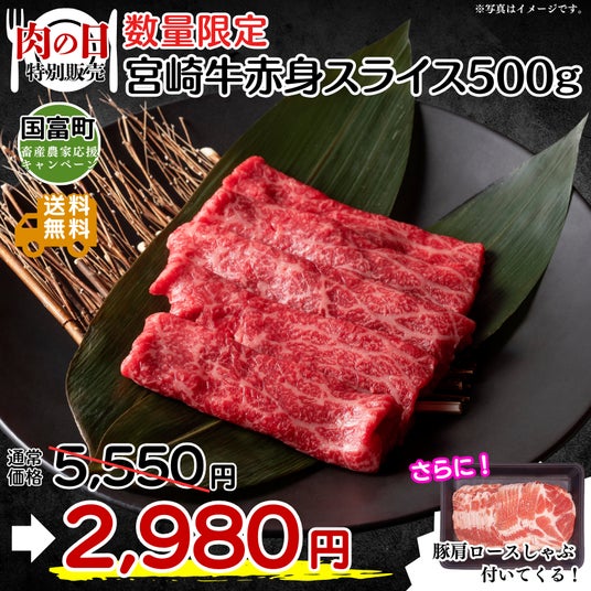 【今だけ送料無料】〈国富町産〉宮崎牛赤身スライス500g(豚肩ロースしゃぶ付)ネット価格5,550円