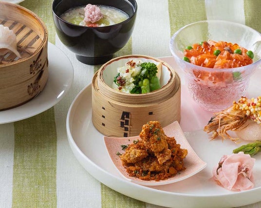 桜の風味とあまおうの果肉が絶妙なバランスのグラスデザート「桜とあまおうババロアのヴェリーヌ」をはじめ、見た目にも可愛らしい「あまおうタルト」や福岡県のお茶を用いた「八女茶のムース」、濃厚なあまおうにバジルのアクセントがきいたソルベなど、華やかなスイーツが揃います。また、中国料理ならではのセイボリーには、「筍と菜の花のセイロ蒸し」をはじめ、ちらし寿司のようなチャーハンや、青山椒塩で楽しむカラフルな「天使海老の揚げ物」など充実のラインナップでご用意いたします。