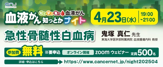 認定NPO法人キャンサーネットジャパン(東京都文京区 理事長 岩瀬 哲)は、血液がんに関するオンラインセミナー「血液がん知っとかナイト」を開催しており、2025年4月は「急性骨髄性白血病」をテーマに開催する運びとなりました。