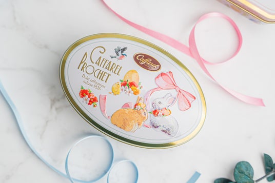 詳細:さわやかな水色がアクセントの蓋に、春の訪れを知らせるイースターエッグやひよこ、花飾りをつけたうさぎ、ギフト感を演出するリボンがデザインされた春満載のプリマベーラシリーズ。コレクションにも最適なオーバル缶にはきのこやリスのホイルチョコレートや定番のジャンドゥーヤなど8粒がアソートされています。