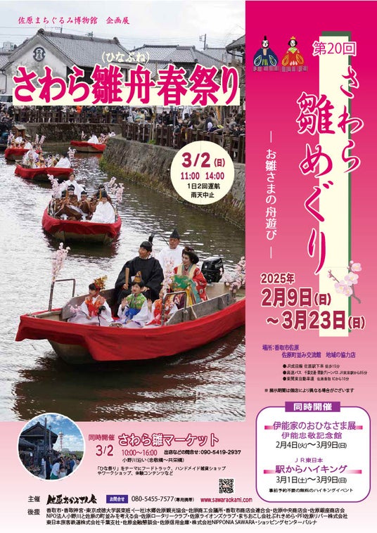 また、同日には「さわら雛舟春祭り」も開催され、雛人形を模した7艘の舟が香取神宮の雅楽の生演奏とともに小野川を進む水上パレードが行われます。華やかな十二単をまとったお内裏様とお雛様の姿は必見です。このイベントを通じて、皆様に春の訪れを深く感じてください。