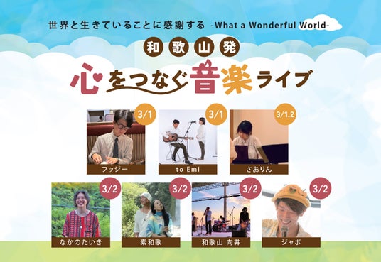 - 和歌山発!心をつなぐ音楽ライブ開催世界とつながる歓び、音楽で感じる特別な2日間和歌山を代表するアーティストが集結し、心に響く音楽をお届けします。音楽のチカラで、人と人、そして世界とつながる感動を