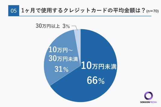「Q5. 1ヶ月で使用するクレジットカードの平均金額は?」という問いに対して、「10万円未満」という回答が66%で最多でした。次いで「10万円以上30万円未満」が31%という結果になりました。