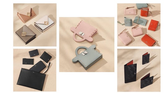 (上から):「セレリア」カードケース ¥67,100(レザー製/ H7.3 W10.8 D1cm)、「セレリア」二つ折りウォレット ¥82,500(レザー製/ H9 W12 D2cm)「セレリア」カードケース ¥67,100(レザー製/ H7.5 W13 D0.5cm)、「セレリア」ジップアラウンドウォレット ¥121,000(レザー製/ H19 W10 D2cm)「セレリア」スリムクラッチ¥137,500(レザー製/ H20.5 W30 D1cm)