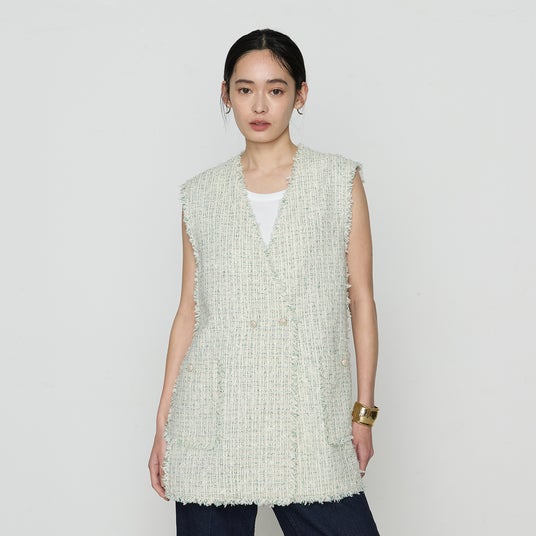 この度、日本の職人の技と細やかな感性により、糸一本一本にこだわった春の雰囲気をまとうオリジナルツイードが完成しました。そのオリジナルツイードを使用し、ジレとクロップトシャツの2アイテムをつくりました。2025年3月1日(土)から全国のコムサ・ステージやコムサ・プラチナの店舗、オンラインストアなどで発売します。
