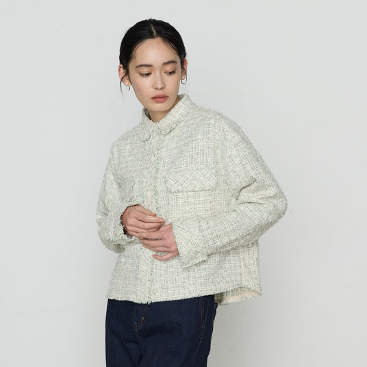 - シャツを短くカットしたショート丈のシャツデザインです。旬のクロップトシャツでクラシカルなイメージがあるツイードをモードに昇華しました。