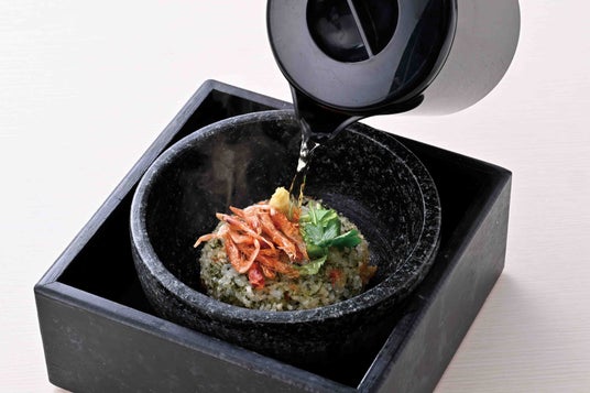 桜海老のおこげ風おにぎり茶漬け桜海老(※)の香ばしさを最大限に引き出したおこげ風のお茶漬けです。出汁をかけていただくこの逸品は、”桜海老”と”お米”の味を引き立てる、〆にもってこいのホッとする優しい味わいです。