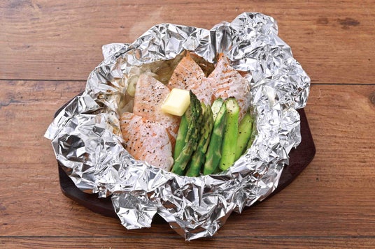 アスパラとサーモンハラスのホイルバター包み焼春の訪れを告げるアスパラガスと、脂の乗ったサーモンハラス(※)。この二つの食材をホイルで包み込み、素材の旨みを引き出す塩とバターでシンプルに焼き上げます。