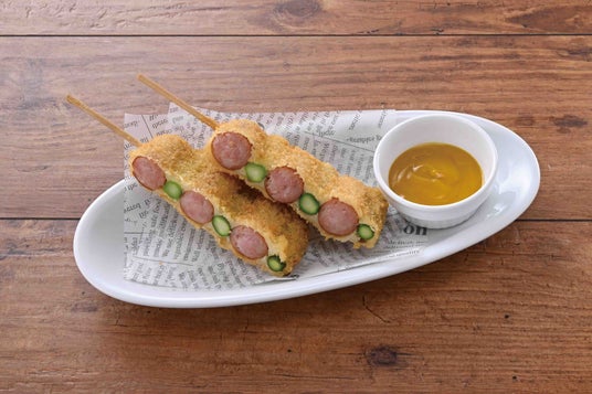 アスパラとソーセージの串カツアスパラとソーセージの串カツは、串カツの中でも人気の組み合わせで、見た目も可愛らしく子供から大人まで大人気の一品です!マスタードソースにディップしてお召し上がりください。