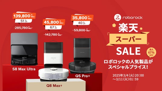 ロボット掃除機やスティック掃除機を製造・開発するBeijing Roborock Technology Co.,Ltd.(本社:中国北京、CEO:Richard Chang)は、2025年3月4日(火)20:00から2025年3月11日(火)01:59まで、楽天市場で開催される「楽天スーパーSALE」に参加し、ミドルモデル「Q8 Max+」をはじめとする人気製品が最大67%オフとなるビッグセールを実施します。