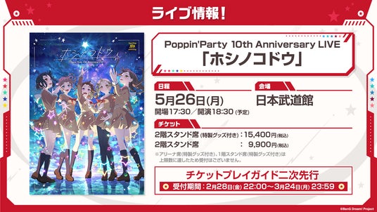 5月26日(月)に日本武道館で開催される、Poppin'Party 10th Anniversary LIVEのライブタイトル・キービジュアルが公開となりました。また、チケットプレイガイド二次先行の受付を開始しました。