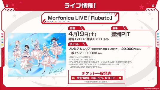 4月19日(土)に豊洲PITで開催される、Morfonica LIVE「Rubato」のライブキービジュアルが公開となりました。また、チケット一般発売も決定しました。