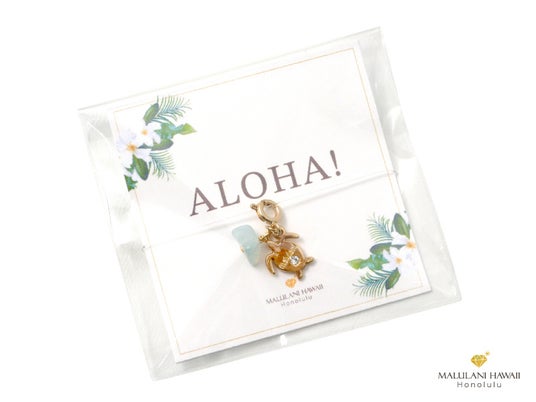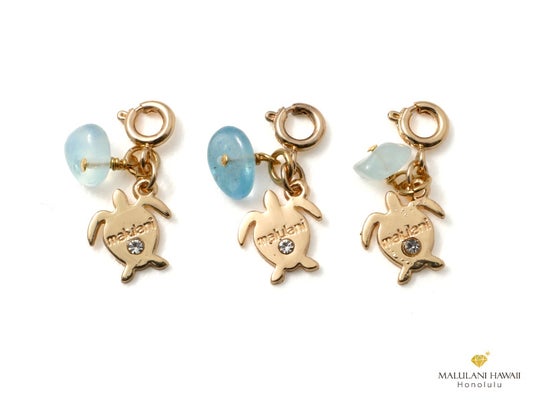 幸福、富、幸せな結婚、コミュニケーション向上の意味合いを持つ石アクアマリンと、海の守り神として伝えられるホヌ(ウミガメ)を組み合わせたチャームは、幸運を運んでくれる人気のモチーフです。