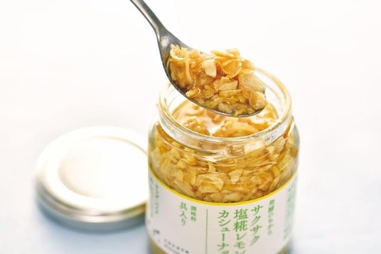 フリーズドライの塩糀、ドライオニオン、カシューナッツでサクサクの食感が楽しい唯一無二の調味料。瀬戸内レモンやりんご酢の爽やかな酸味、塩糀のうまみがぎゅっと詰まっています。