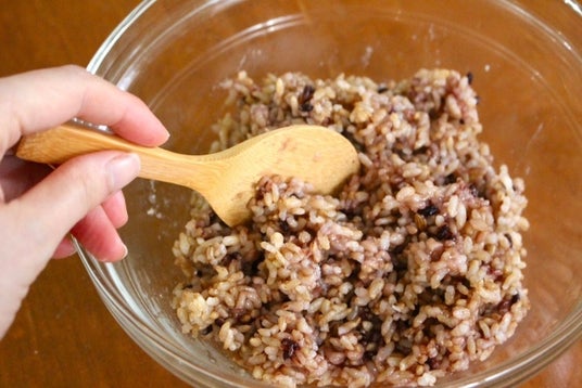 3.で温めた玄米に少しずつ加え、切るように混ぜたら冷ましておく。調味料は、玄米がべちゃべちゃにならない程度に状態を確認しながら加えるようにする。