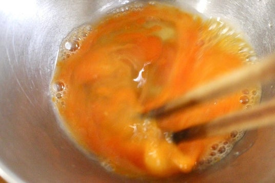 錦糸卵を作る。適量のサラダ油をひいて温めたフライパンに、砂糖・塩を加えて溶いた卵を流しいれ、うすく広げて焼く。