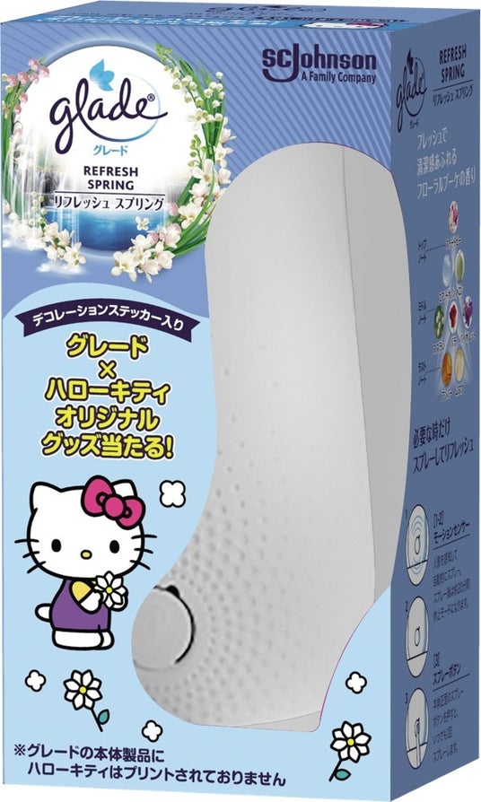 ハローキティ オリジナルデコレーションステッカーが付いたグレード消臭センサー&スプレー本体を3月3日より数量限定で発売します。ハローキティ のパッケージが目印。グレード 消臭センサー&スプレーはセンサーが人影を感知し自動でスプレーする室内用の芳香剤です。