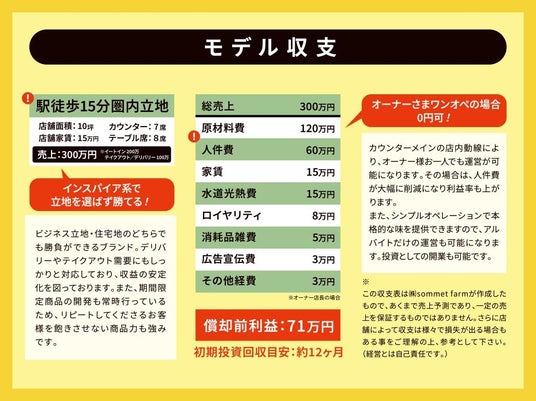 2024年の1月にオープンした新ジャンルのモデルながら、FC加盟したいとのお声が続出中!直営店実績が10坪500万円(住宅街)であることから多くの期待のお声をいただいております。特にラーメンにはないテイクアウト、デリバリー需要が高いことから業態変更のお声が非常に多くいただいております。店舗で炒めるだけのシンプルオペレーションを実現しておりますので飲食未経験でも開業が可能です!