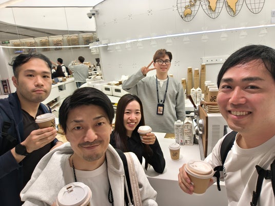日本の有名カフェチェーンで店員さんと一緒に記念写真。