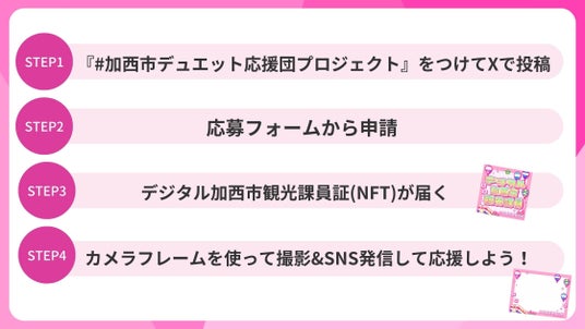 「デュエット応援団プロジェクト」は本取り組みのプロジェクト名です。「デュエット」は互いの想いが響き合う温かな共感を、「応援団」は地域を熱く盛り上げる団結力を象徴しています。このプロジェクトでは、従来の一方通行だった応援活動を双方向に進化させます。加西市は寄附者をデジタル加西市観光課員として活動を支援、寄附者は加西市の魅力を発信するという相互作用を通じて、持続的な関係人口の創出と地域活性化を目指します。