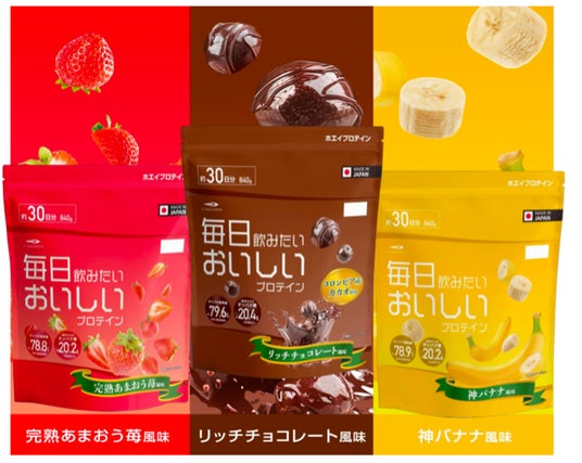 フレーバーは完熟あまおう・神バナナ・リッチチョコレート風味の3種類をご用意。おいしく手軽に不足しがちなタンパク質を補えるため、トレーニングをする方はもちろん、健康を意識したい方にも最適です。