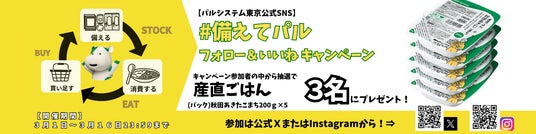 生活協同組合パルシステム東京(本部:東京都新宿区大久保、理事長:松野玲子)は3月1日(土)から3月16日(日)まで、公式SNSキャンペーン「#備えてパル」を開始します。3月1日が「防災用品点検の日」であることから、災害への備えについて考えるきっかけづくりとして実施します。公式SNSの対象投稿へのリポスト・いいねで、災害時に役立つパックごはん(200g×5)を抽選でプレゼントします。