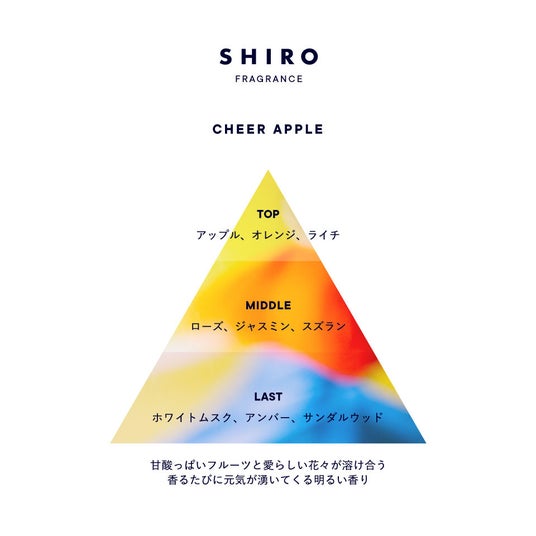 思わず笑みがこぼれるほどにフレッシュな「チアアップル」の香りは、新たなスタートで溢れる春に、皆様の新生活を応援したいという想いから誕生しました。アップルを主軸とした爽やかなフルーツがはじけるトップノートから、ローズやジャスミン、スズランが華やかさを添えるミドルノートへ。ラストはホワイトムスクやアンバー、サンダルウッドがやさしい余韻を残します。