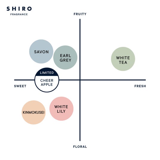 チアアップルは定番5種のフレグランスと比べると、最もバランスの取れたフルーティーフローラルの香り。サボンの爽やかさや、アールグレイのフルーティーさがお好きな方には、特におすすめの香りです。
