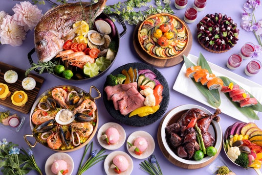 約50種、シェフの手作りにこだわった国際色豊かなお料理をゆったりとした空間でどうぞ。“Colors of Spring” をコンセプトにした、春の色どりと味わいをたっぷりお楽しみください。活気溢れるライブキッチンでは、ジューシーなローストビーフやチキン、出来立てパスタやヌードルをお届けします。また菜の花や筍など春野菜たっぷりの前菜やメインディッシュ、ホテルメイドスイーツも勢ぞろい。ディナータイムにはサステナブルサーモンのローストなども登場し、ご家族やご友人皆様でご堪能いただけます。