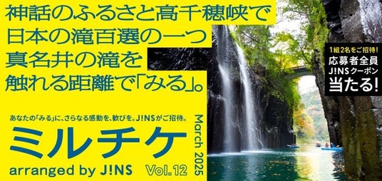 株式会社ジンズ(以下JINS)は、日常では体験できない特別な「みる(見る・観る・視る)」をチケットにして毎月抽選でご招待する「ミルチケ」(https://www.jins.com/jp/campaign/miruticket/)のVol.12として、神話のふるさと高千穂峡で日本の滝百選の一つ、真名井の滝を触れる距離で「みる」体験への応募受付を、2025年3月4日(火)より開始します。