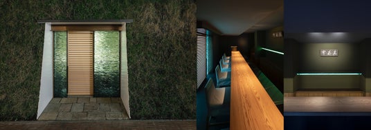 現代美術作家の杉本博司と建築家の榊田倫之が設計した隠れ家バー。木目を水の波紋の広がりに見立てた無垢の杉材を利用したカウンターや、職人が丁寧に表情をつけた美しい積層ガラスが印象的な空間。