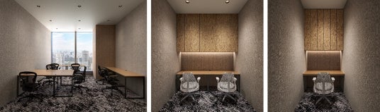 (左)共用廊下 (中)茶室をイメージした会議室 (右)Focus Room