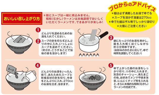●ラーメン屋直伝のおいしく食べるための調理ポイントも本商品パッケージに記載しています。