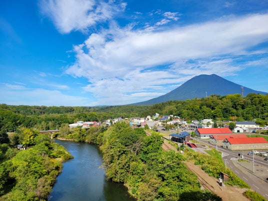 夏のニセコ町の風景。ランドマークである羊蹄山と、尻別川を望む牧歌的な雰囲気が魅力