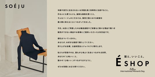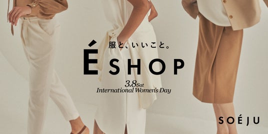 モデラートは、こうした衣類のロスを削減し「必要としている人にとって良いもの」をお客さまに届け、お客さまとともによりよい社会を共創していきたいという想いから、このたび「E SHOP」を開催することになりました。第1弾として、3月8日の国際女性デーにあわせて「SOEJU」がビジョンとして目指す「誰もが心地よく社会とつながれる世界」を体現する取り組みとして開催を決定いたしました。