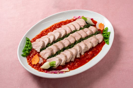 「豚ヒレの塩麴ロースト 大葉トマトソースがけ」豚ヒレを塩麹と特製醤油だれに漬け込み、じっくりと低温調理してロースト仕立てにしました。