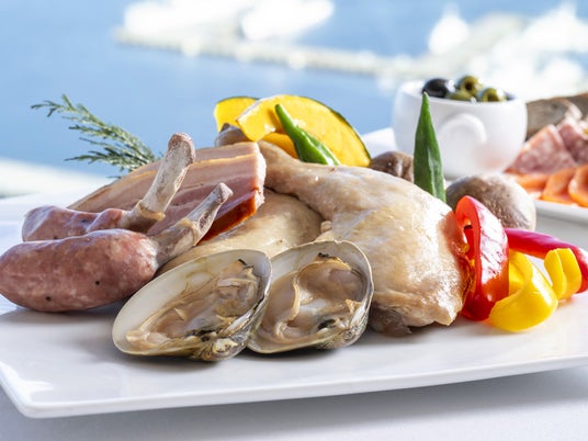 バーベキューは、テーブルに用意されたBBQグリルを使ってお客様ご自身で焼いていただくスタイル。リブフランクや厚切りのベーコン、大ぶりの蛤のほか、ミネラル豊富な塩、にんにく、ハーブなどに漬け込み、低温で2時間以上調理した柔らかくてジューシーな骨付き鶏もも肉のコンフィなどがお楽しみいただけます。また、スキレットごとグリルで温めて仕上げる海老と野菜のアヒージョや、素材の良さを感じられる新鮮な野菜なども取り揃えています。