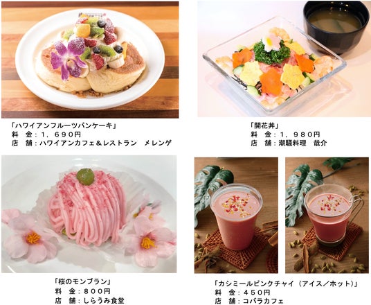 4月21日(月)までの期間中、島内のレストランや軽飲食店舗では、花のフードメニューをご用意いたします。桜をモチーフにした「桜のモンブラン」をはじめ、「カシミールピンクチャイ」、春をイメージした「開花丼」、など、期間限定のフードやドリンクで春のお花見シーズンをお楽しみいただけます。