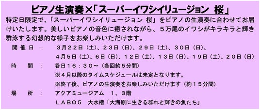 水族館「アクアミュージアム」にある高さ8m、水量1,500トンの大水槽「大海原に生きる群れと輝きの魚たち」では、国内最多飼育数5万尾のイワシが桜を連想させる音楽やピンク色の照明に合わせて乱舞する「スーパーイワシイリュージョン 桜」を、3月7日(金)~4月21日(月)内の特定の時間帯にて開催いたします。