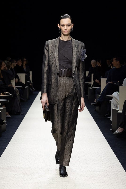 落ち感のあるしなやかなシルクのパンツスーツ、構築的な要素を削ぎ落としながらも気品が漂うコート、完璧なバランスを携えるジャケットなど、ひとつひとつにアルマーニらしさが息づいています。