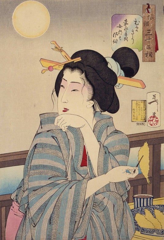 てんぷらを食べる女性「風俗三十二相むまさう 嘉永年間女郎之風俗」 (月岡芳年/画 1887年(明治21)) 展示期間:3/20~4/20