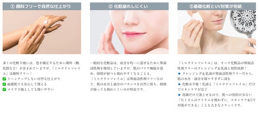 米国の食品医薬品局(FDA)の研究によって、肌に塗布した紫外線吸収剤が体内に取り込まれ血中に流れ込むことが明らかになって以降、紫外線吸収剤の安全性を疑問視する声は年々増加傾向にあります。紫外線を反射させる役割を担う紫外線散乱剤は、肌への負担が少ないとされる一方で、紫外線防御率の低さや、白浮きする点などが課題です。オーク化粧品は「安全で、機能性も高く、質感もよく、さらには保湿効果もある」という4つの希望を全て叶えたミルクを開発しました。