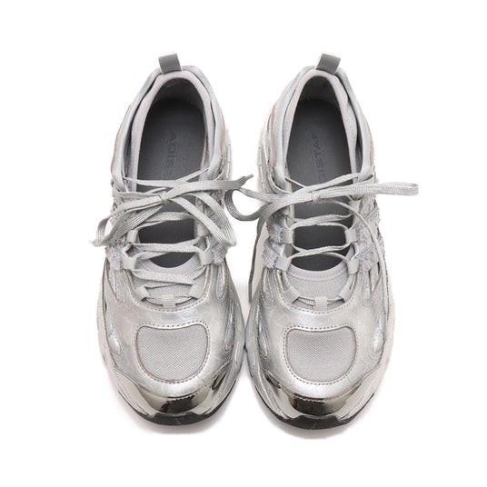 ”Silver Veil(シルバー ヴェール)“と称した今作は、その名の通りトレンドのシルバーカラーを踏襲した新作モデル。透かしのライナーと花柄を模したアッパーが、まるで軽やかさと華やかさを与えるヴェールを纏っているようなデザインで足元からフェミニンな印象を与える。