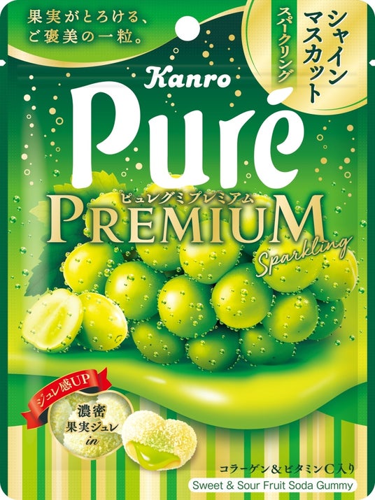 特徴 :爽快なスパークリンググミと濃密果実ジュレのハーモニーが楽しめる、プレミアムなピュレグミ